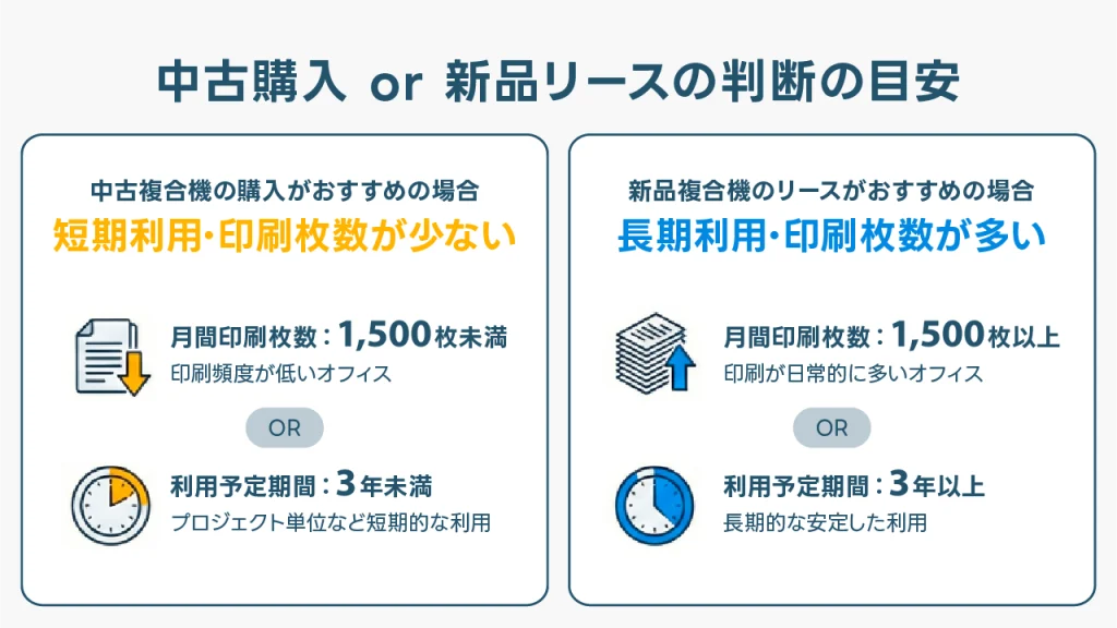 (あまり使わない・短く使うなら、費用を抑えやすい) - 毎月の印刷が1,500枚以上、または、3年以上使う予定(長期)